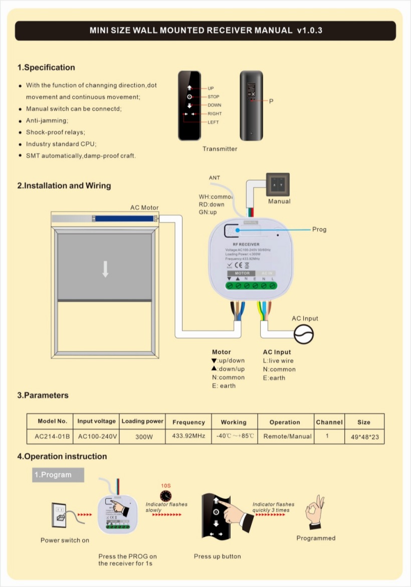 AC214-01B Wall-mounted AC Tubular Motor radio receiver specifications